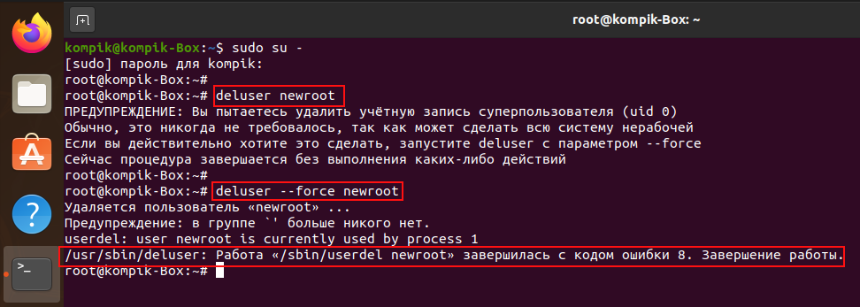 Во-первых, этот дубль-root не отображается на экране входа в систему (нужно нажать «нет в списке» и ввести его имя и пароль), не отображается он и в графической утилите управления пользователями. Во-вторых, у вас могут возникнуть проблемы с его удалением. Ubuntu советует использовать для удаления рутового пользователя ключ —force, но когда мы выполняем команду удаления deluser —force newroot, система сообщает об ошибке из-за использования newroot процесса с ID 1, принадлежащего пользователю root! То есть newroot стал как-бы зеркалом рута.