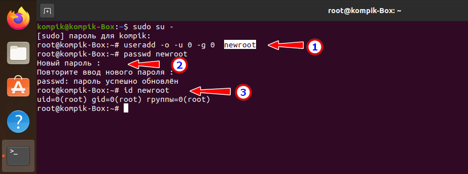 Да очень просто: используя ключи -o, -u, -g и -s Первый ключ разрешает создание пользователя с неуникальным ID, второй назначает ему идентификатор пользователя, а третий — идентификатор группы, которые совпадают с идентификаторами рута (0). Четвёртый ключ назначает командную оболочку. Сама же команда будет выглядеть следующим образом, где newroot — новый рутовый пользователь.