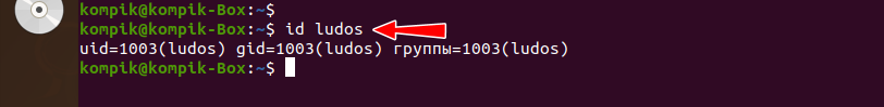 При выполнении команды useradd автоматически будет создана новая группа и домашняя папка юзера. В процессе система попросит придумать и ввести для нового пользователя пароль и указать дополнительные сведения, которые, в отличие от пароля, можно проигнорировать. Это будет самый обычный пользователь с домашней папкой в каталоге /home и командной строкой bash. Получить базовые сведения о пользователе можно командой id имя-юзера. Для примера мы только что создали нового пользователя ludos и вывели командой id ludos о нём сведения. В результате получили строку из трех частей.