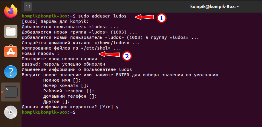 Команда предложит указать некоторые данные, в частности пароль для нового пользователя. Все данные, кроме пароля, опциональны. Чтобы принять данные по умолчанию, просто нажмите Enter.