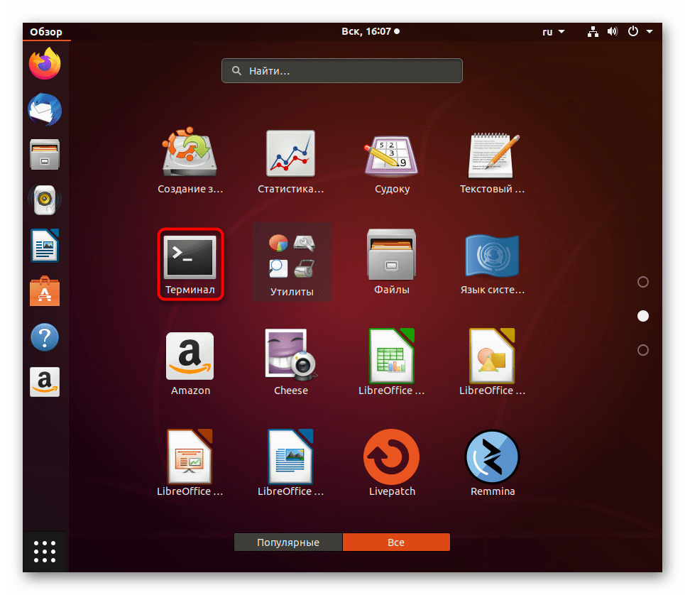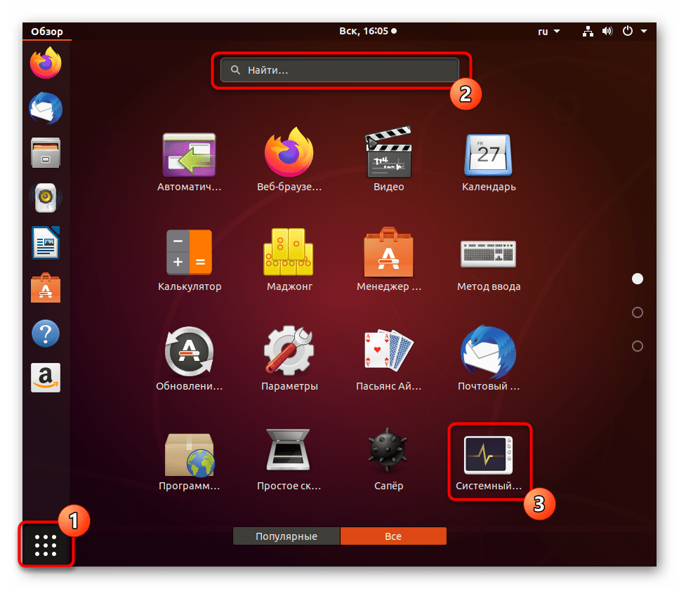 - Перейдите в меню «Показать приложения», где отыщите «Системный монитор» и запустите его, кликнув по значку левой кнопкой мыши.