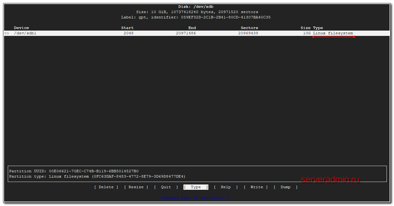 Создадим один раздел на диске с помощью утилиты cfdisk.