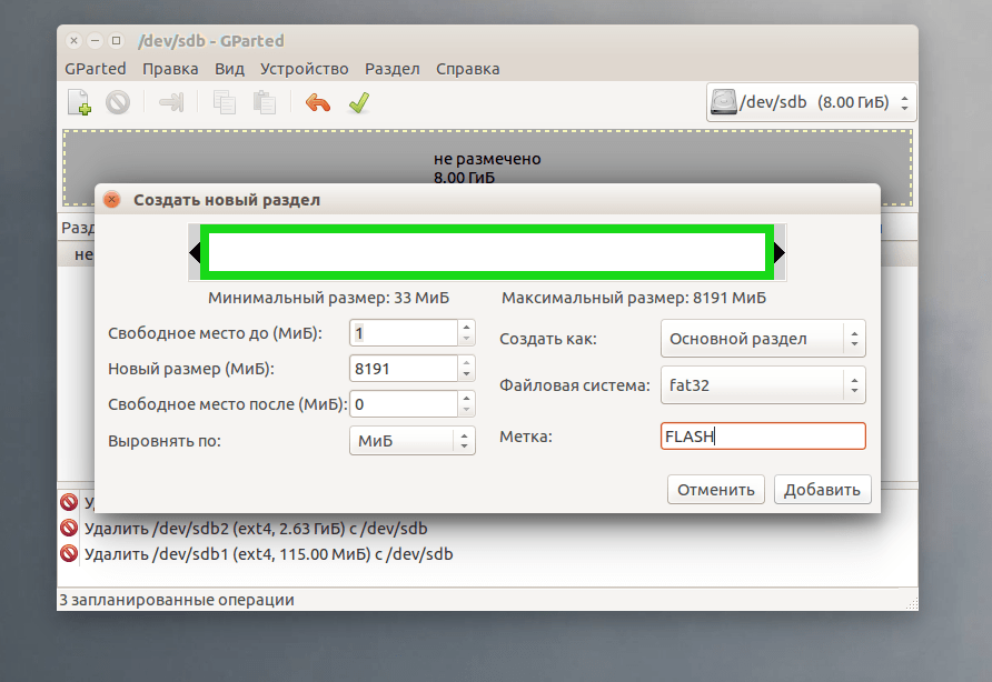 Работать будем в системе Linux. Сначала посмотрите, какое имя устройства у вашей флешки, например, с помощью программы Gparted или в терминале командой: