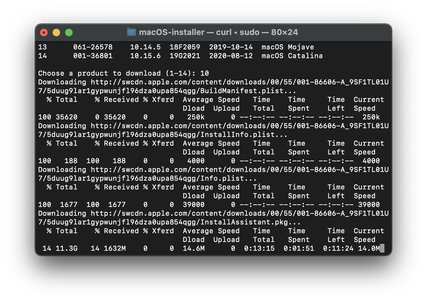 Как вы видите, мы получаем большой список установщиков macOS. Если вам нужна определенная версия macOS, вы можете выбрать её, набрав её номер. Для этого примера, мы выберим 10: