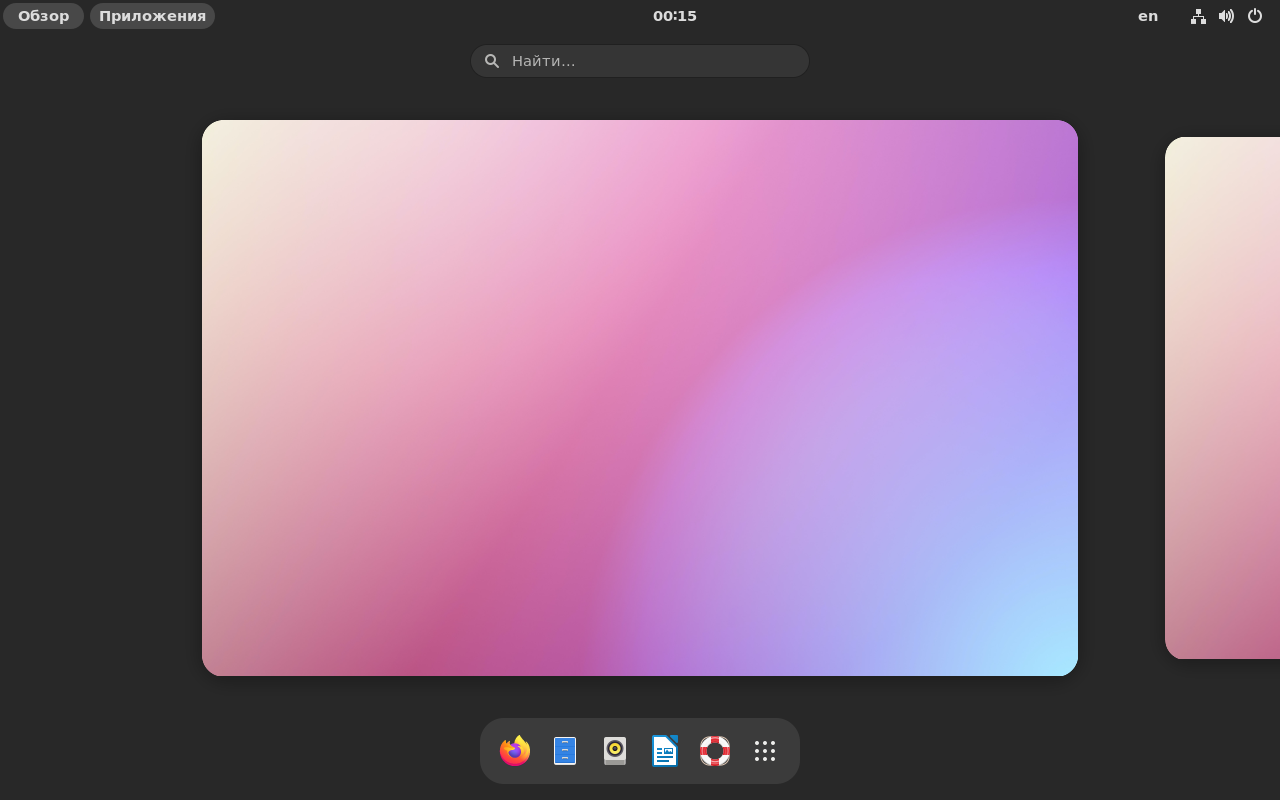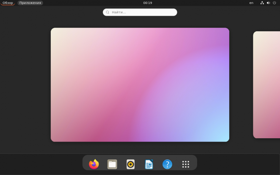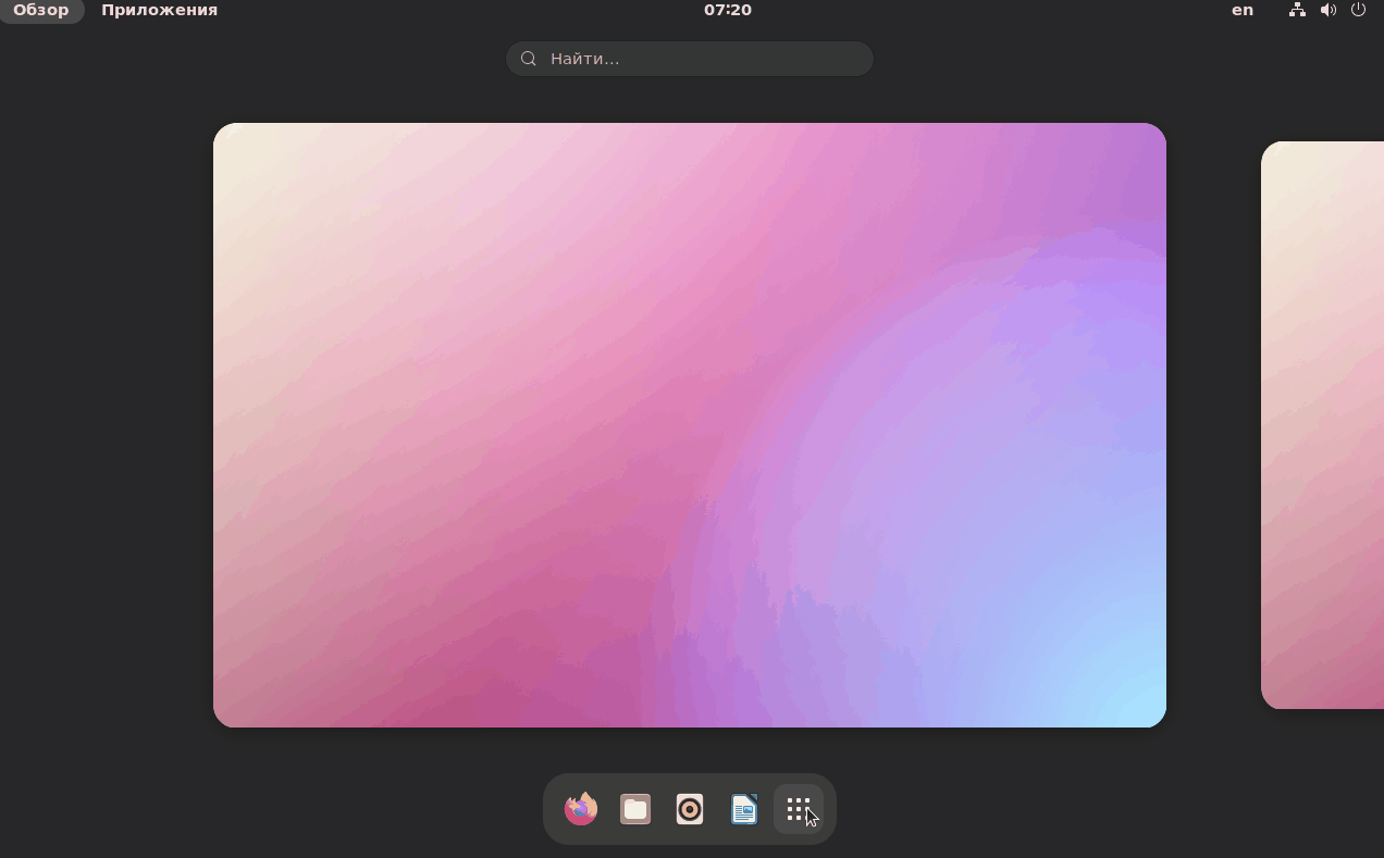 В GNOME 40 после входа в систему, пользователя встречает переосмысленный Обзор. Теперь рабочие столы расположены горизонтально. А также стоит отметить, что док переместился в нижнюю часть.