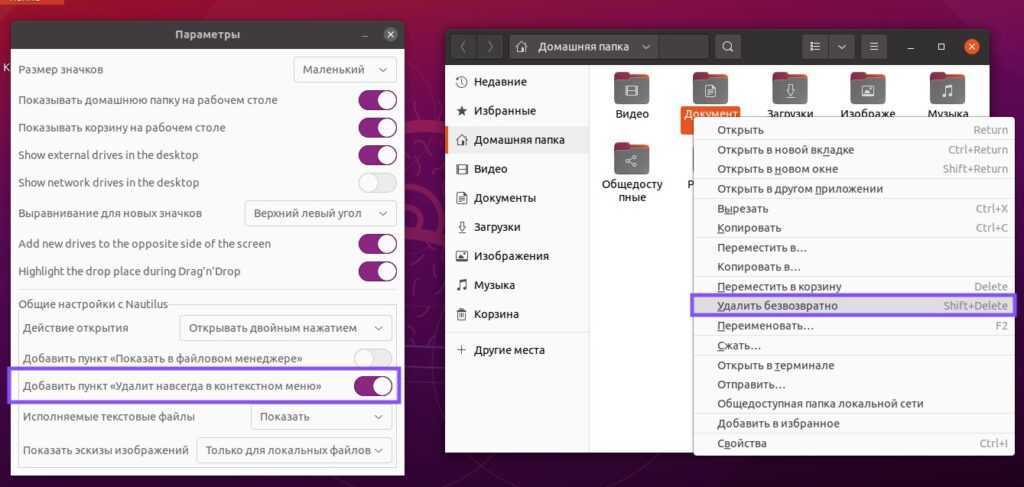 Теперь клик по модальному окну «параметры» на рабочем столе переносит нас не в системные настройки, как это было раньше, а открывает панель с дополнительными настройками. Здесь вы можете выбрать размер значков, показ домашней папки и корзины на рабочем столе, добавить в контекстное меню возможность удалять файлы навсегда.
