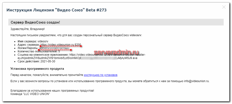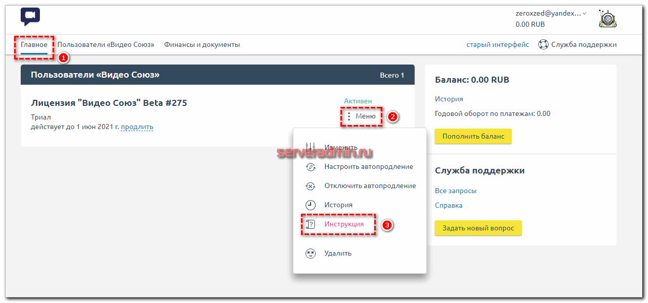 После этого для вас будет создан персональный сервер. Параметры доступа к нему можно посмотреть, выбрав в меню раздел Инструкция. Там будет ссылка на адрес сервера и учетные данные для авторизации.