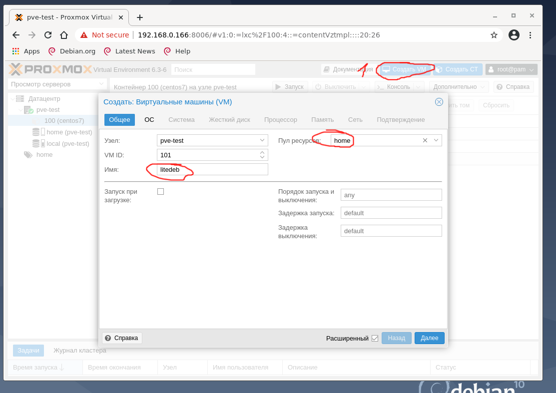 Обратите внимание, что веб интерфейс Proxmox VE позволяет создавать виртуальные машины двух типов: