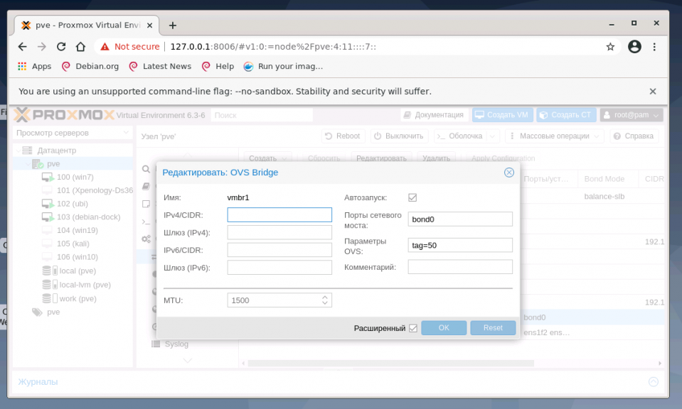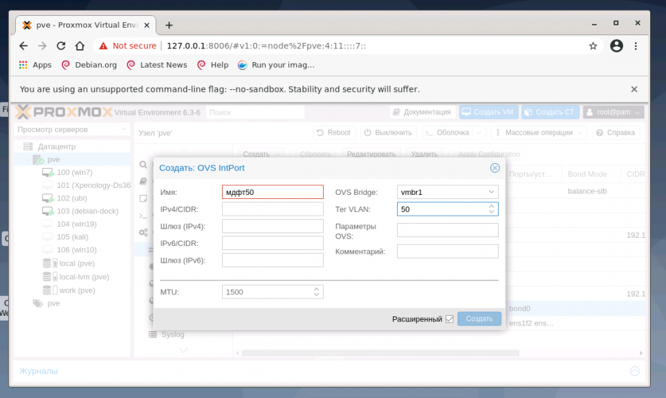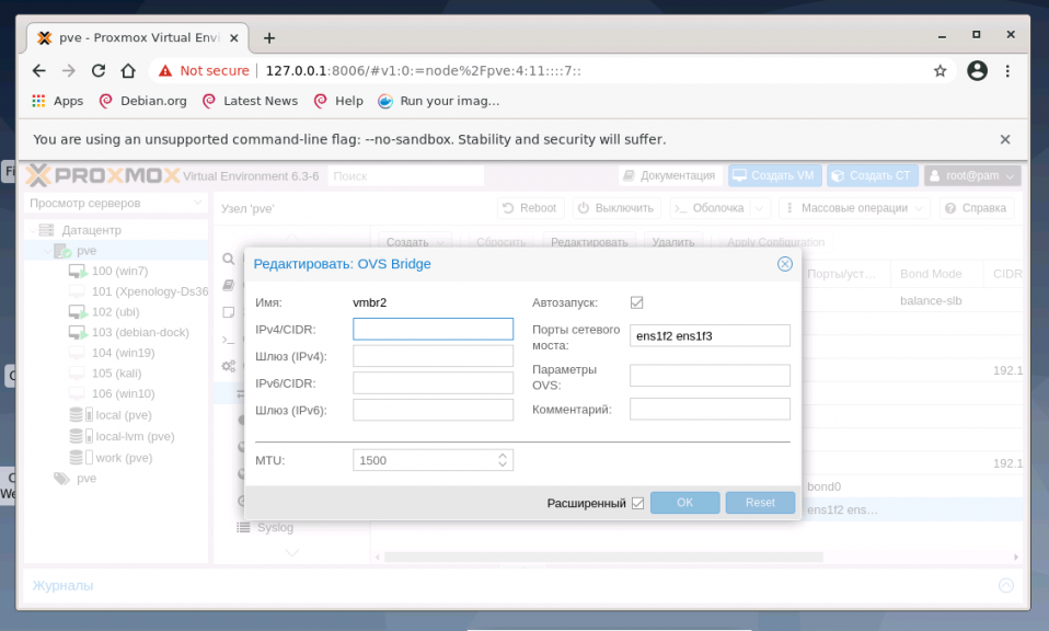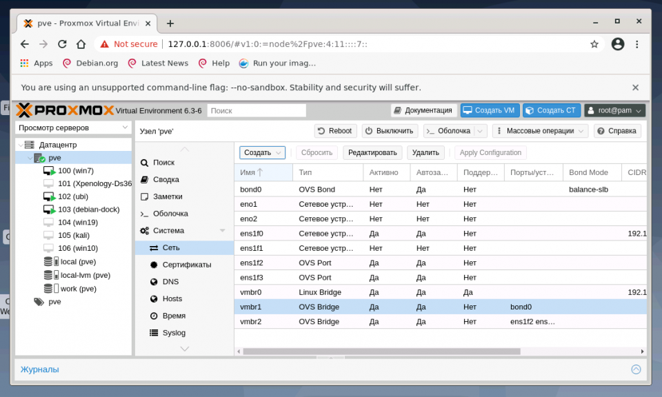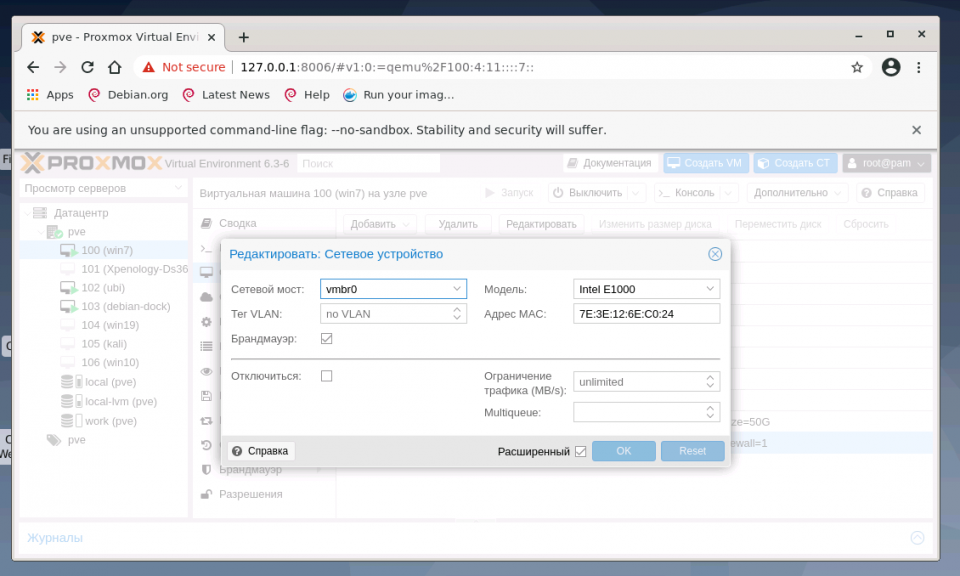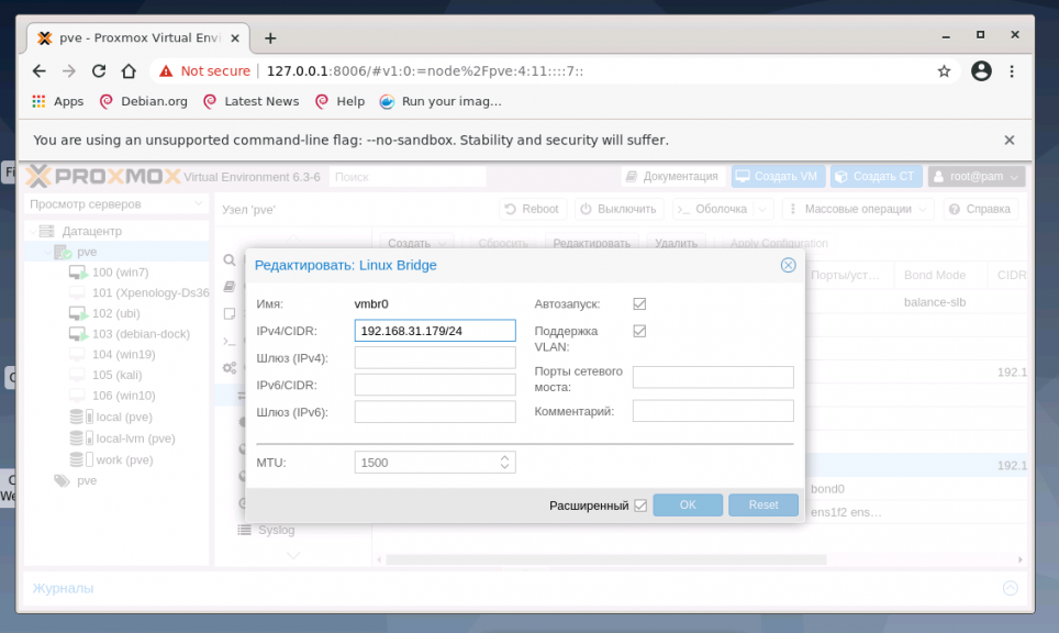 Итак, созданный нами ранее сетевой мост vmbr0 используется в виртуальных машинах Proxmox VE для создания виртуальных сетевых интерфейсов для них. Через vmbr0 интерфейс будет подключён к роутеру сети, к которому подключена сетевая карта, на которой работает vmbr0.