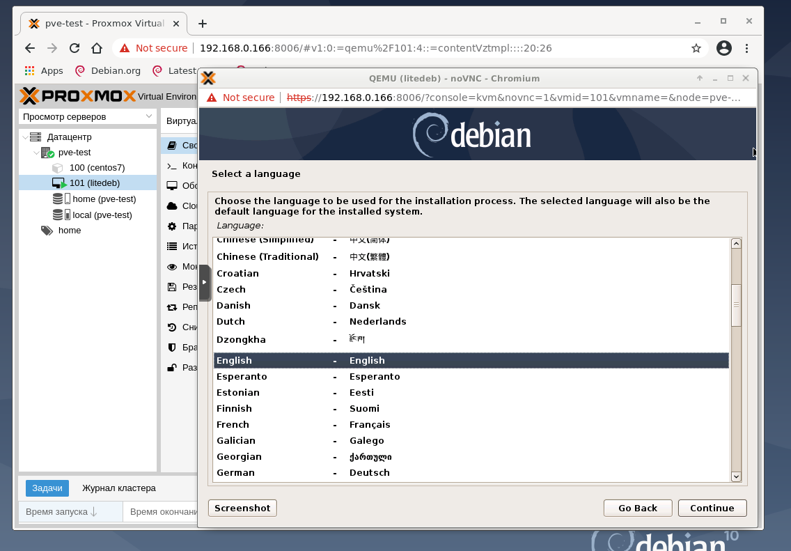 Если все нас устраивает и ничего менять не надо, нажмите кнопку Запуск и откройте Консоль. На тестовом хосте выяснилось, что лучше эксперимент проводить на дистрибутиве Debian 10 netinstall, и поменять тип жёсткого диска со SCSI на SATA, а также увеличить размер оперативной памяти виртуальной машины. И результат работы после нажатия кнопки Запуск и подключению к Консоли: