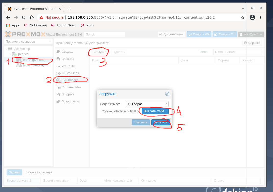 Параллельно можно поставить загрузку дистрибутива debian10 netinstall ISO со своего рабочего компьютера в хранилище home. Для этого выберите в WEB-интерфейсе хранилище home, тип хранения выберите ISO Images и нажмите кнопку Загрузить, в появившемся окне выберите файл образа ISO со своего компьютера и нажмите ОК.