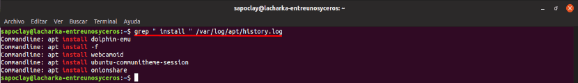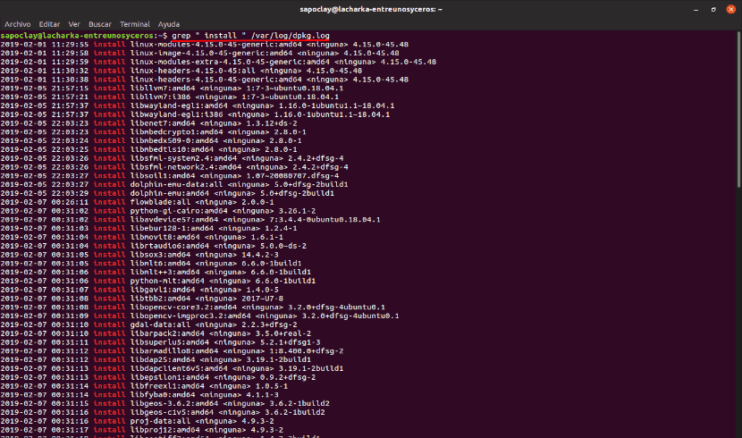 В Ubuntu есть несколько способов сделать это. Мы сможем проверьте журнал dpkg или apt. Чтобы сделать этот запрос, мы можем использовать команда grep, чтобы отфильтровать результат и показать только установленные пакеты. Вы можете увидеть журнал dpkg, открыв терминал (Ctrl + Alt + T) и набрав в нем: