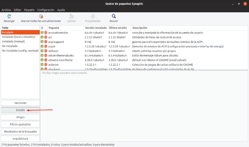 Другой графический способ увидеть пакеты, установленные на вашем компьютере, — использовать диспетчер пакетов Synaptic. Вам просто нужно пойти в опция «Статус» а затем выберите тот, который говорит «Установлены «.