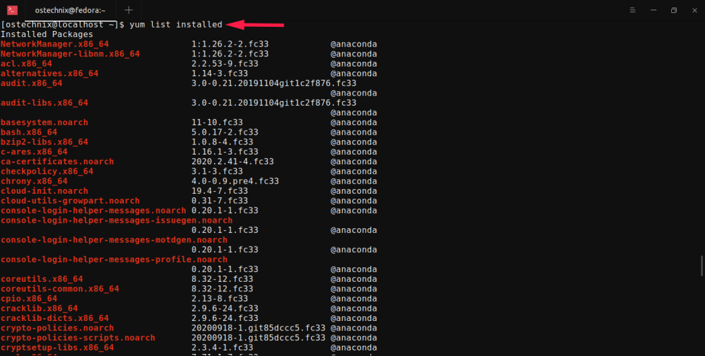 Чтобы найти список установленных пакетов в Fedora, RHEL и его клонах, таких как CentOS, запустите: