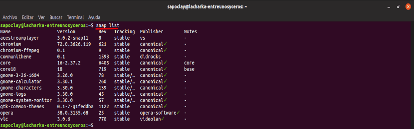 Если нас интересует знать установленные пакеты Snap В системе, в терминале (Ctrl + Alt + T) мы будем использовать следующую команду: