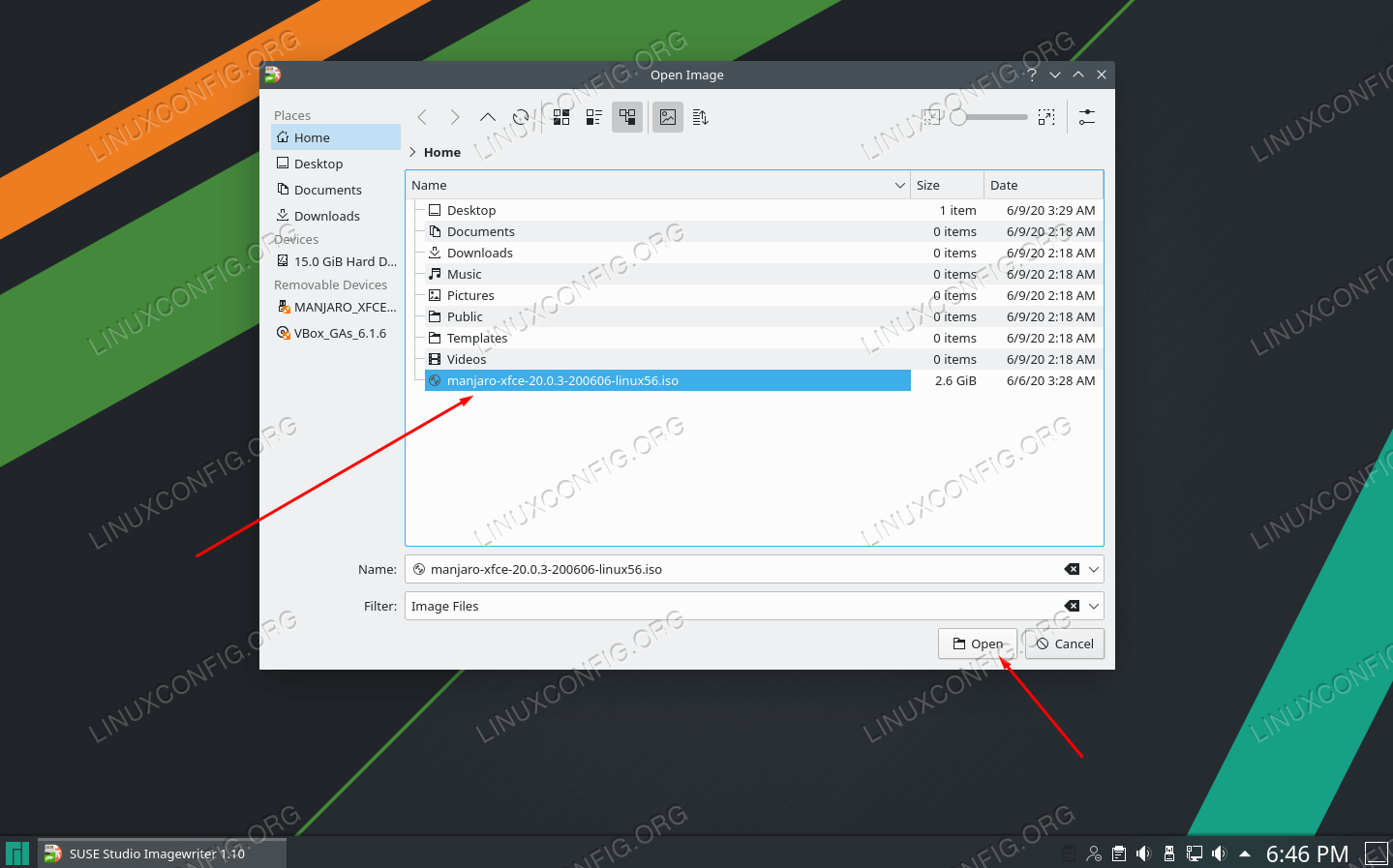 Нажмите на значок в центре и перейдите туда, куда вы загрузили ISO-файл Manjaro. Выделите его и нажмите «Открыть».