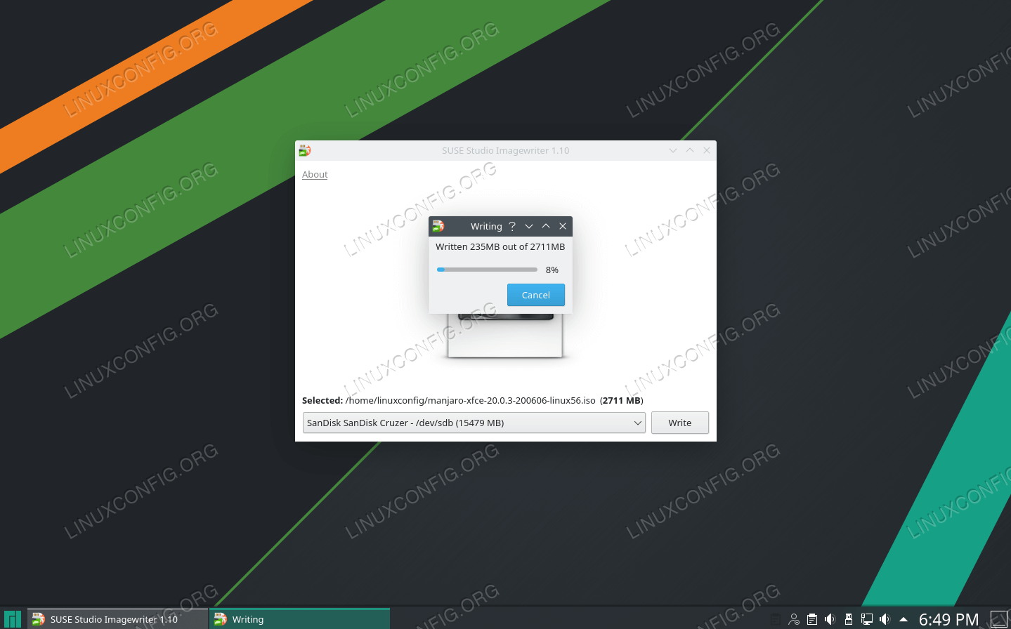 ImageWriter начнет передачу содержимого ISO-файла на USB-накопитель. Когда он завершит этот процесс, вы будете готовы использовать USB-накопитель для установки Manjaro на ПК.