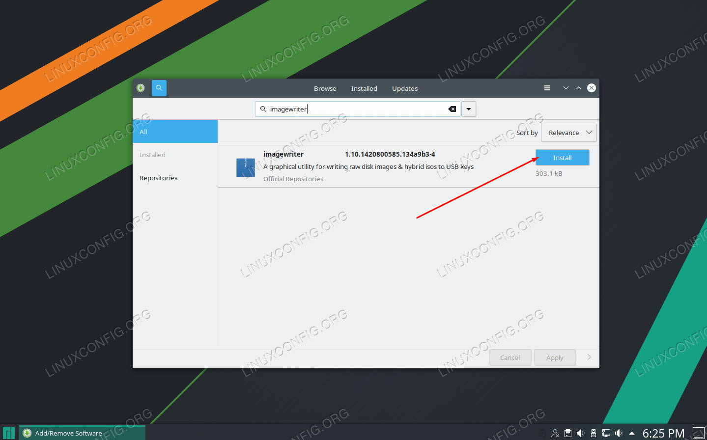 Найдите в вашем программном менеджере ImageWriter или возьмите похожий инструмент, с которым вы знакомы или хотите опробовать его. Вставьте USB-накопитель и откройте ImageWrter.