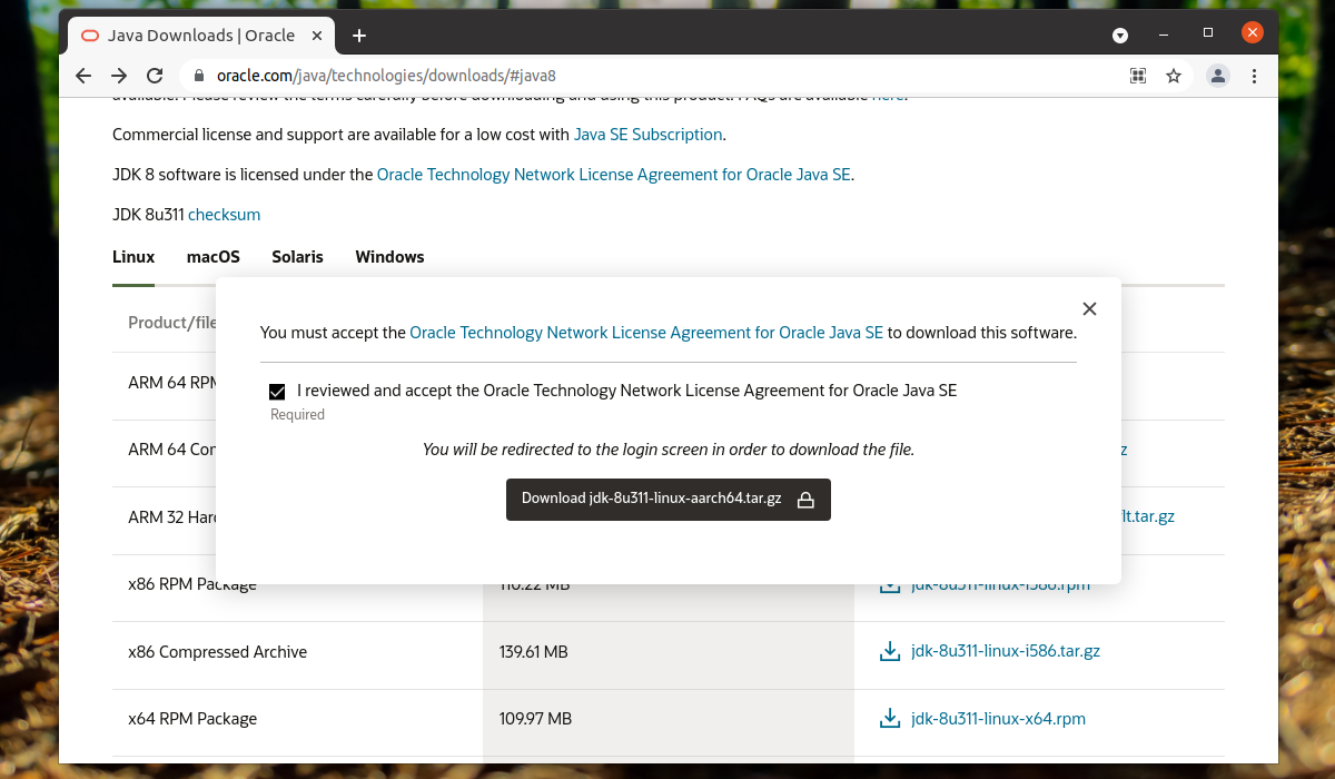Для скачивания файла необходимо войти в свою учетную запись Oracle или создать новую, только после этого начнется загрузка выбранной версии. После завершения загрузки необходимо создать директорию /usr/lib/jvm/: