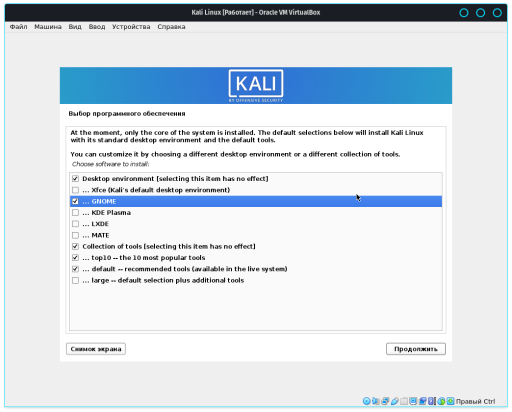 При выборе графического окружения вам предстоит отметить галочкой ту оболочку, которую вы предпочитаете. Не забудьте убрать галочку с того окружения, которое идет по умолчанию, если вы решили его сменить. Остальные параметры оставляем как они есть. Я же выберу окружения GNOME 3, после чего установка продолжится: