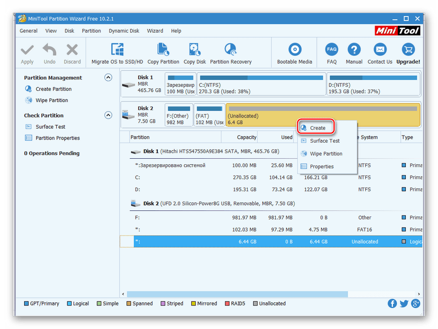После скачивания и установки запустите программу. Правой кнопкой мыши щелкните по неразмеченному разделу и нажмите «Create». Появится сообщение Windows, нажмите « OK».