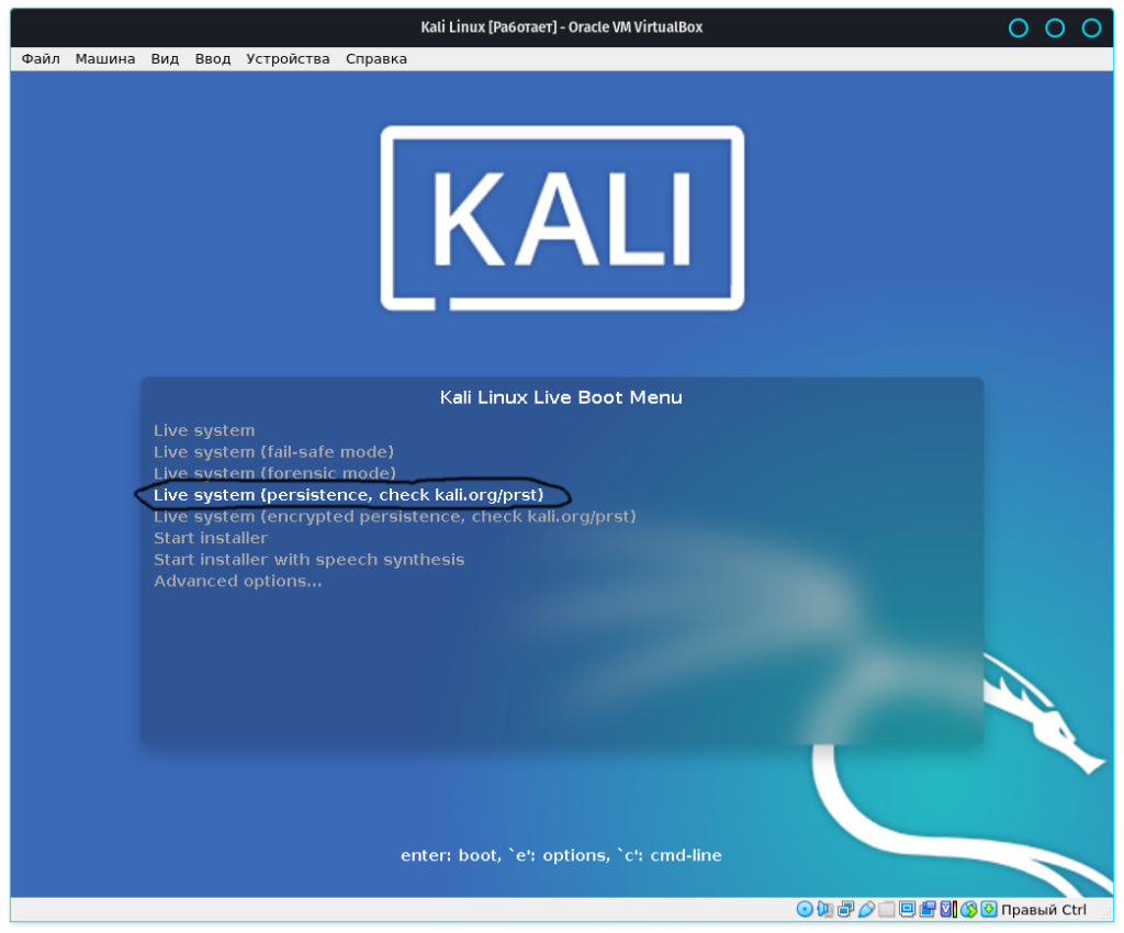 Теперь вы можете загрузиться с вашей USB флешки, на которой вы только что создали раздел “persistence” и переходить к настройке вашей Kali Linux. Для этого необходимо загрузиться с пункта “Live system (persistence, check kali.org/prst)”: