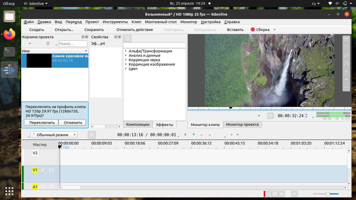Как видно из названия, Kdenlive главным образом ориентирован на окружение рабочего стола KDE. В наличии весь набор базовых функций, поддержка основных кодеков и форматов. Кроме того, возможна настройка пользовательских профилей и настройка горячих клавиш под себя. Отдельные окна можно извлекать из основного интерфейса программы и использовать как плавающие.