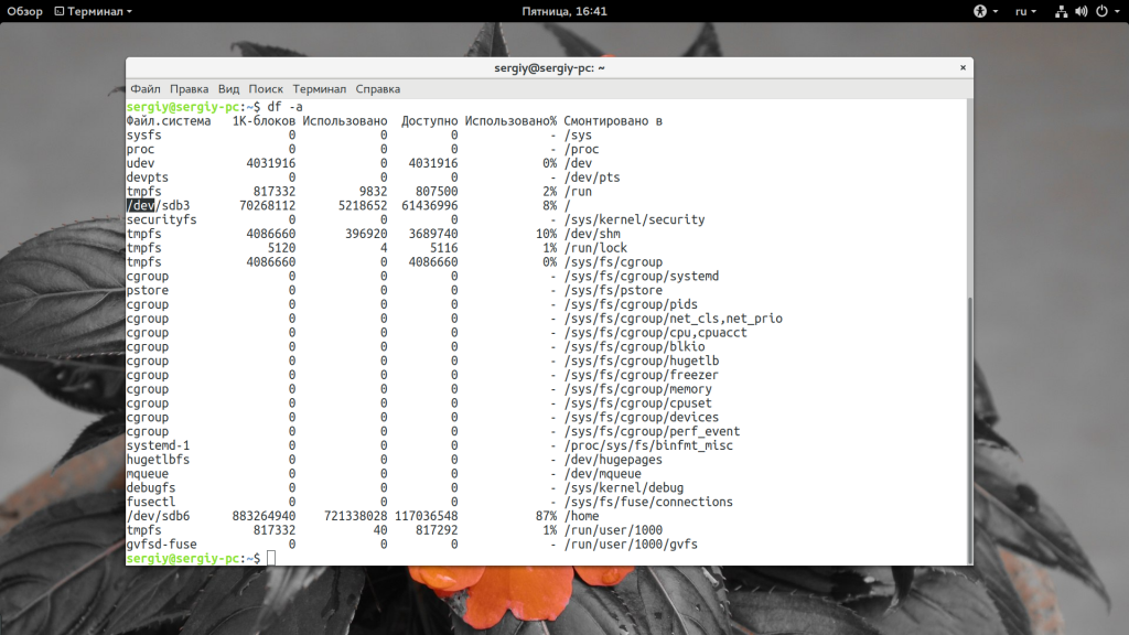 Это самое популярное сочетание опций, потому что оно дает максимально понятную информацию и уже можно судить о том, что происходит на диске. Например, мы видим, что в домашней папке уже занято 87% места и, возможно, пора что-то удалить. Если задать опцию -a, вы можете получить информацию обо всех файловых системах известных ядру, которые были смонтированы: