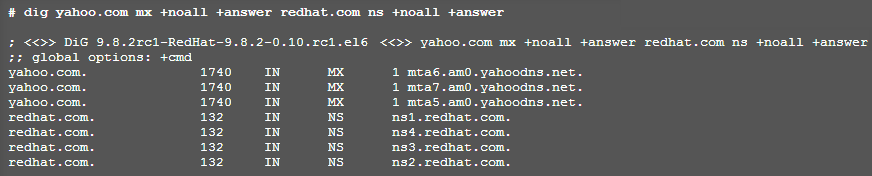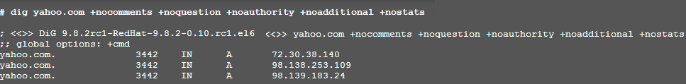 # dig yahoo.com +nocomments +noquestion +noauthority +noadditional +nostats