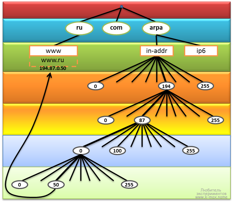 При этом, команду dig -x 194.87.0.50 правильнее будет представить как dig 50.0.87.194.in-addr.arpa., то есть записи в поддоменах *.in-addr.arpa. представлены в так называемой обратной нотации (или reverse форме), то есть хосту с IP 194.87.0.50 будет соответствовать PTR-запись, имеющая FQDN 50.0.87.194.in-addr.arpa., которая в свою очередь указывает на домен www.ru.. Хочется отметить, что чаще всего за обратную зону и ее редактирование отвечает поставщик интернета.