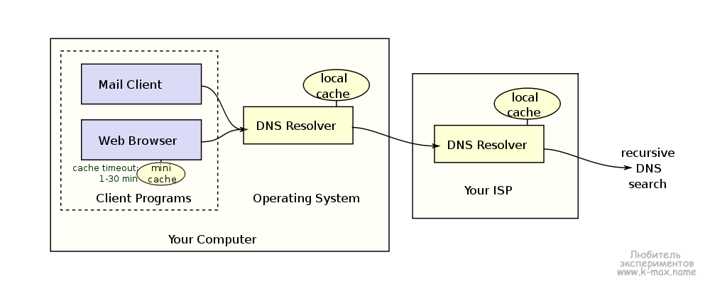 Кроме кэша на ДНС сервере, существуют кэши интернет-браузеров, кэши резолверов. Довольно прозрачную картину предоставляет Wikipedia: