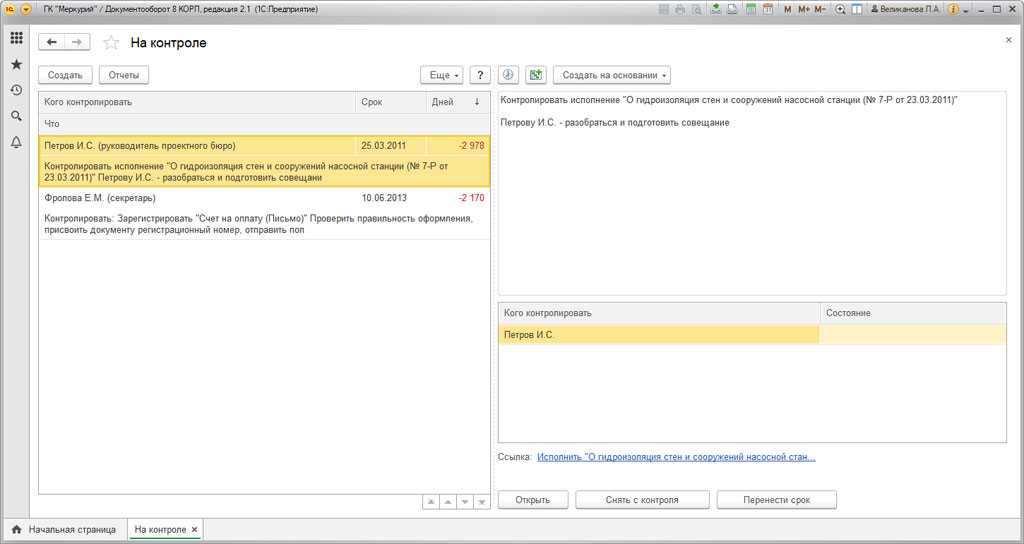 Через виджет «Контроль» можно быстро получить доступ к контрольным поручениям. Здесь же присутствуют и статусы текущих состояний объектов.