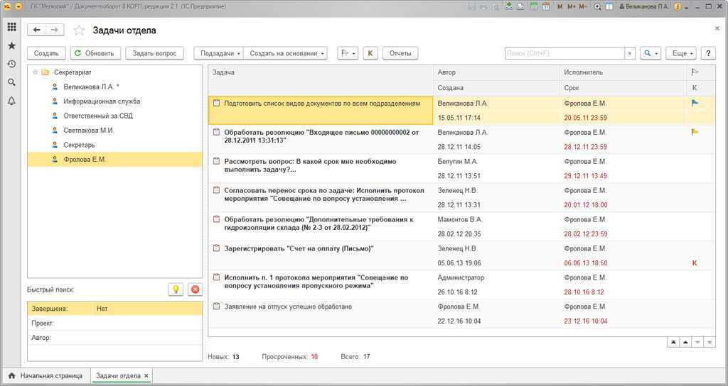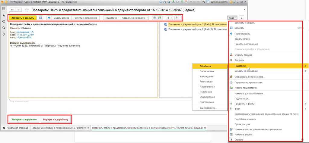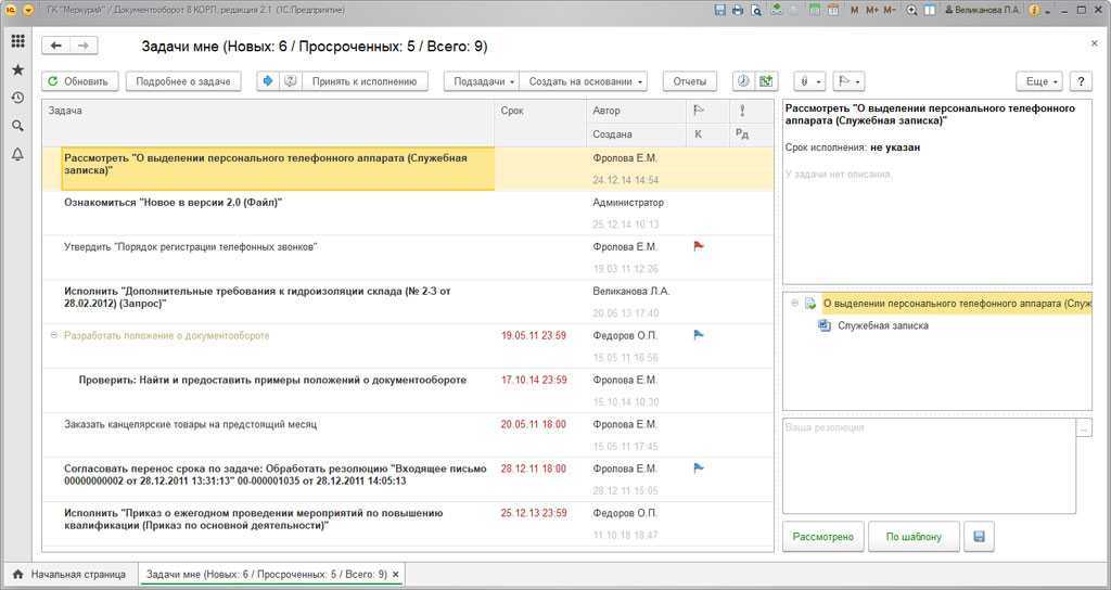 Имеющаяся здесь подсистема управления процессами дает возможность создавать поручения и задачи различной степени сложности. Как произвольного характера, так и сделанные на основе имеющихся шаблонов.