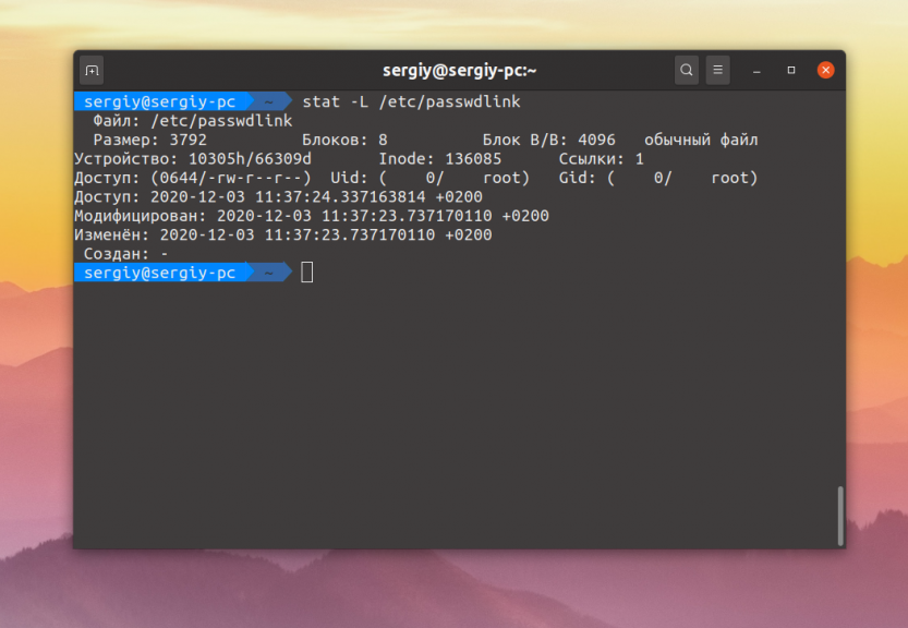 Это все опции команды. Теперь давайте разберемся с примерами использования. Чтобы посмотреть информацию о файле достаточно запустить программу без опций передав ей путь к файлу, например /etc/passwd: