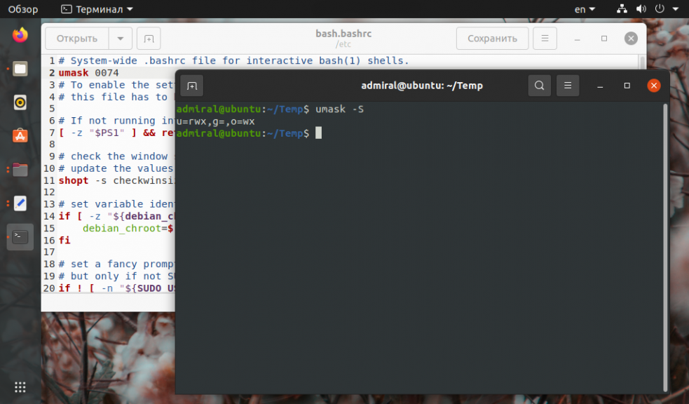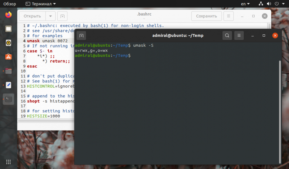 Другой пример использования не столь безопасный. Команда прописывается в конфигурационных файлах пользователя. Изменить маску для оболочки терминала можно добавлением строчки с командой umask в файле ~/.bashsrc. Это справедливо для дистрибутивов на основе Debian. В других дистрибутивах может потребоваться редактирование файла .profile.