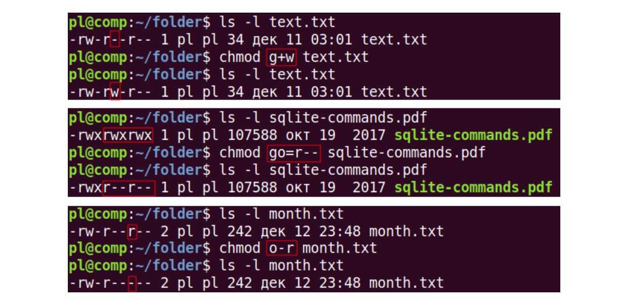 Также имеется возможность работы с отдельными правами. Оператором + или — можно разрешить или запретить определённое действие, остальные биты в маске останутся нетронутыми.