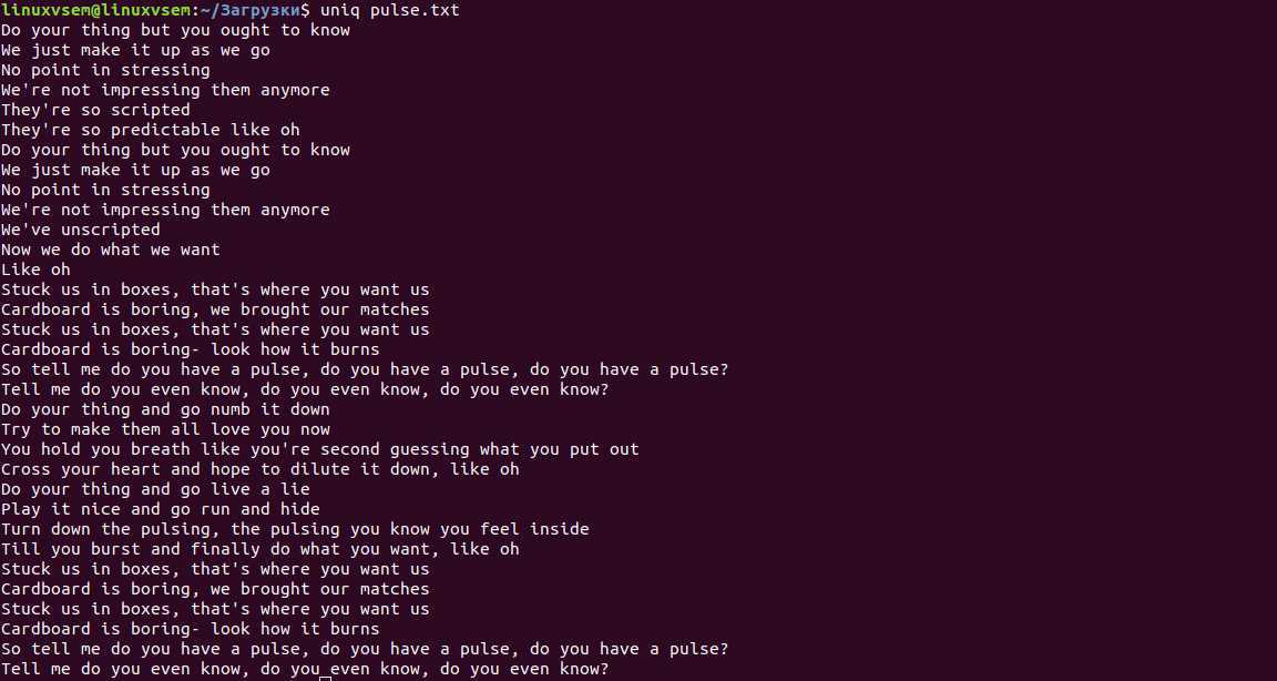 Uniq означает уникальный, и его работа заключается в удалении повторяющихся строк из данных. Однако одно ограничение заключается в том, что эти линии должны быть смежными.