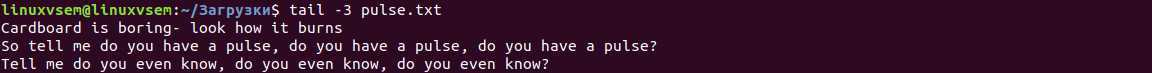 Данная команда противоположна head. Tail — это команда, которая печатает последние строки ввода. По умолчанию он напечатает последние 10 строк, но мы можем изменить это с помощью аргумента командной строки.