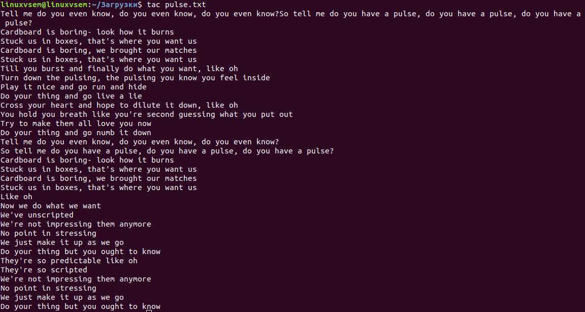 Ребята из Linux известны своим забавным чувством юмора. Программа TAC на самом деле является CAT наоборот. Это было названо так, как это делает противоположность CAT. Получив данные, он напечатает последнюю строку первой, вплоть до первой строки.