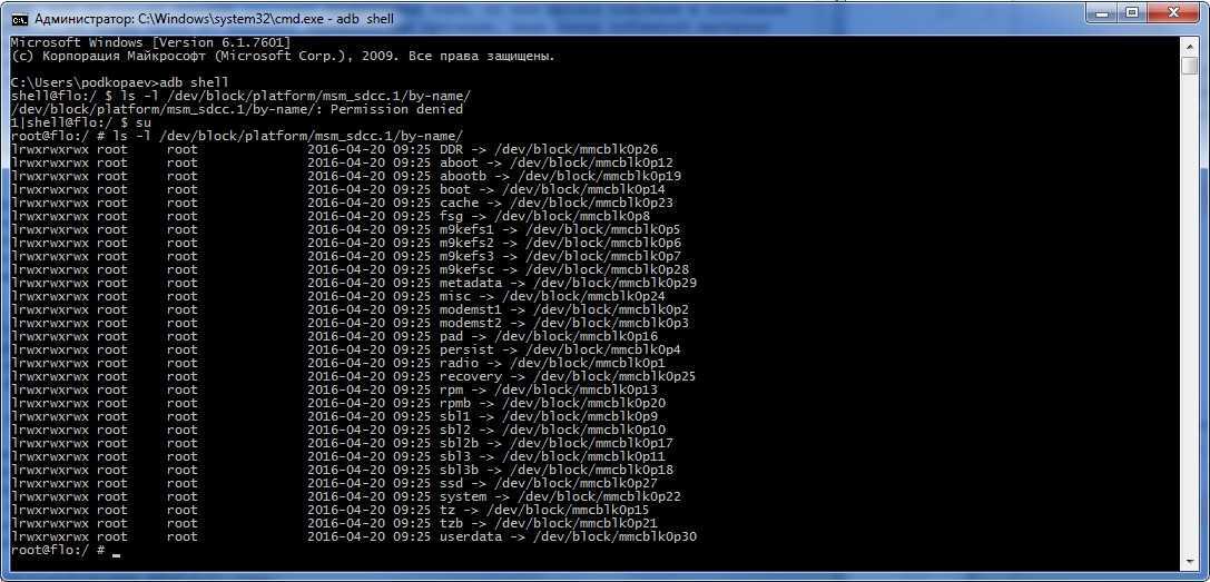 В консоли появляется знак $ (далее по тексту этот знак будет означать необходимость ввода предварительной команды adb shell), и после этого можно вводить серию команд, получая после каждой отклик. Второй способ — если необходимо ввести только одну команду, можно писать ее подряд за adb shell.