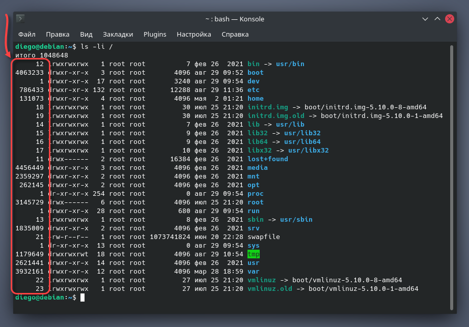 На следующем скриншоте показан мой корневой каталог с соответствующими номерами инодов: