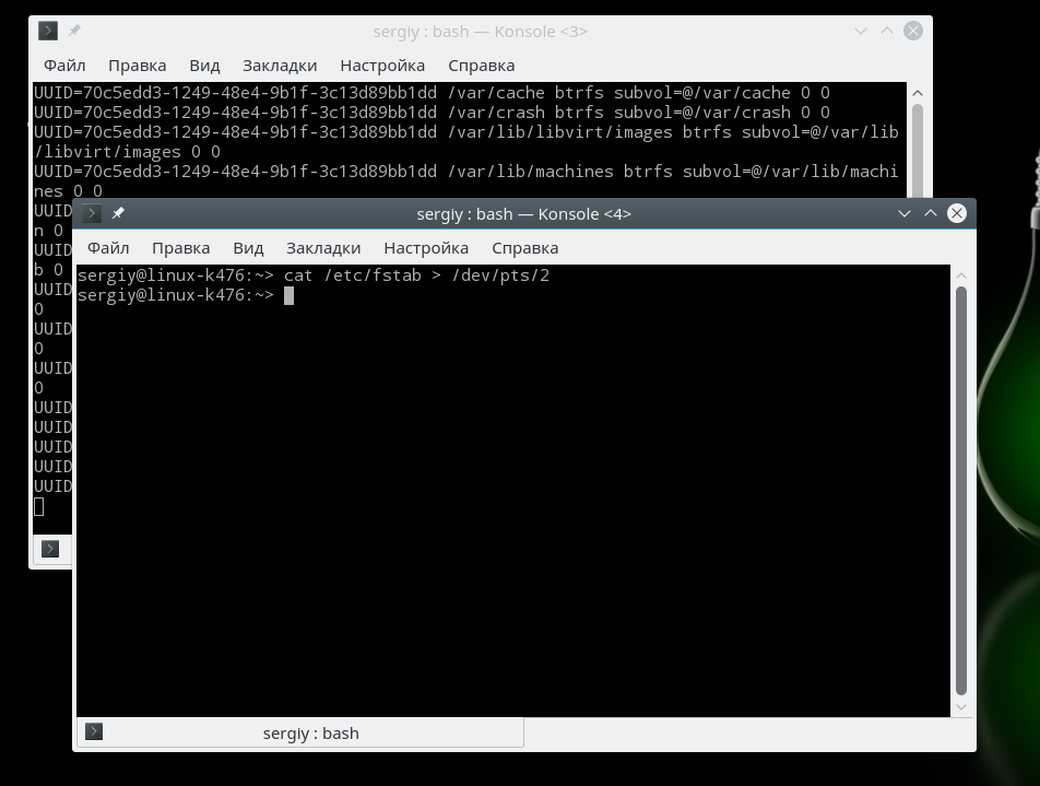 Затем вернитесь во вторую консоль. Здесь вы увидите отправленную строку, Hello World. Все это можно повторить с помощью эмуляторов терминала в графическом интерфейсе, только здесь будут использоваться псевдо-терминальные устройства /dev/pts/*. Теперь попробуем отобразить содержимое файла fstab с помощью cat в другом терминале: