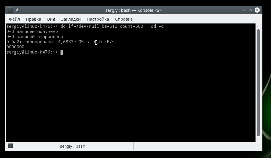 Обратите внимание, что ничего выведено не будет, потому что это устройство пусто, оно только принимает данные и никуда их не сохраняет. Устройства /dev/random и /dev/urandom позволяют получить случайные комбинации чисел или байт