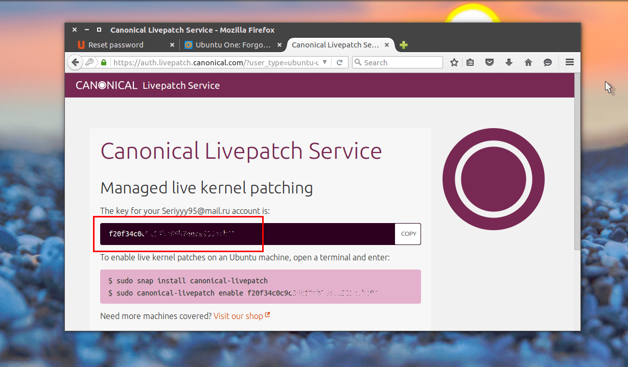 Посмотрим, как работает Canonical Livepatch Service. Перейдём по ссылке выше, получим токен, а далее выполним: