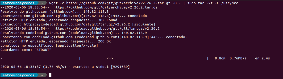 Следующее, что мы сделаем, это вернемся к терминалу. В этом и благодаря инструменту Wget, мы собираемся загрузите и извлеките исходный код Git в каталог / USR / SRC. Для этого воспользуемся следующим скриптом: