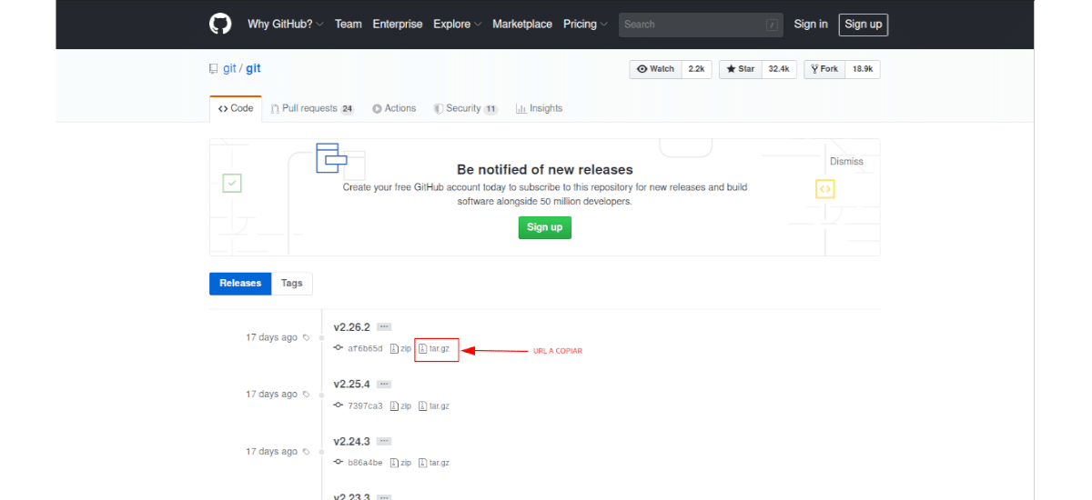 Следующим шагом будет посетите через веб-браузер страница релизов проекта в GitHub. Попав в него, нам нужно будет скопировать последний URL-адрес ссылки, заканчивающейся на .tar.gz.. В тот момент, когда я пишу эти строки, последняя стабильная версия Git, доступная на этой странице, — ‘2.26.2″: