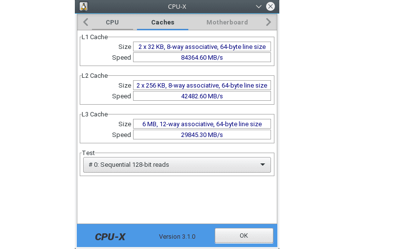 Остальные вкладки имеют больше отличий. Так кэш не просто дублирует блок первой вкладки, но ещё и проводит тест скорости. Здесь имеется бенчмарк. Разработчик заявил о том, что не планирует развивать программу в дальнейшем. Но всё же он продолжит обновлять базы данных и исправлять баги. Установить CPU-X можно с помощью команды: