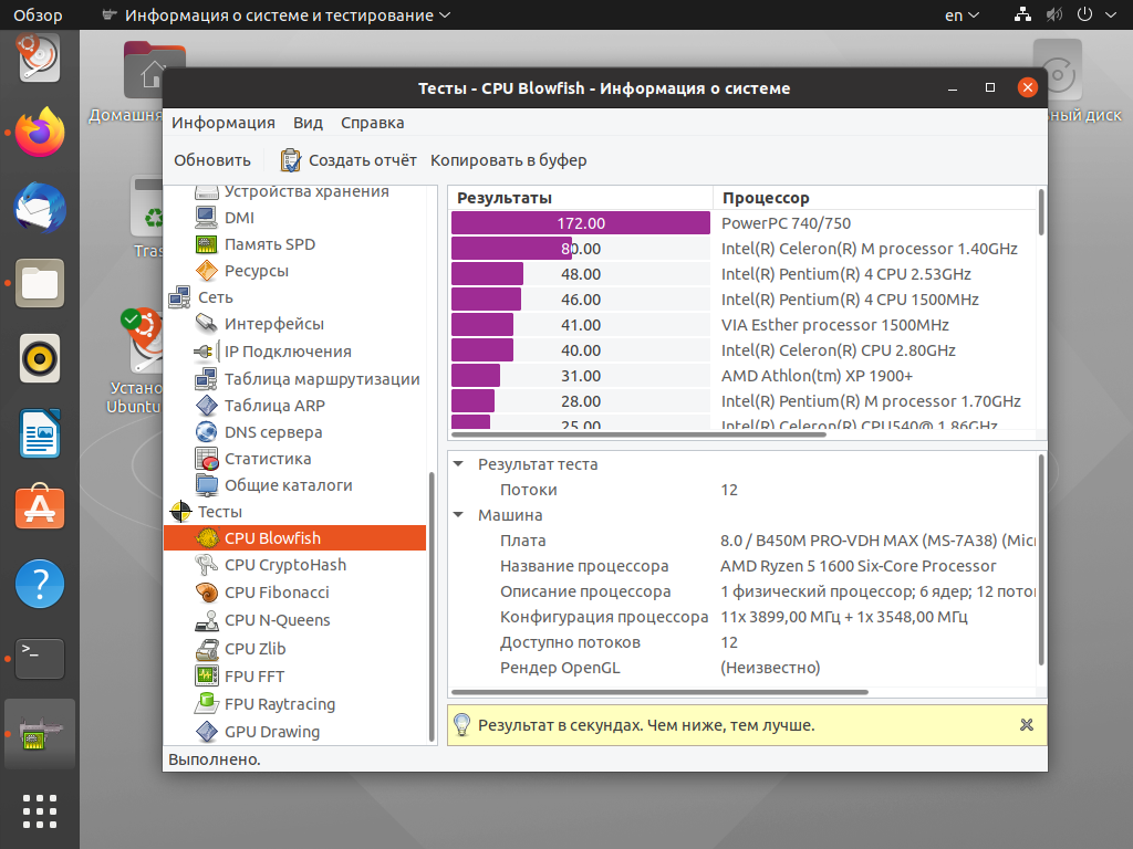 Отдельного упоминания заслуживает набор тестов. С его помощью можно узнать производительность компьютера в различного рода задачах и сравнить результаты с другими процессорами, хотя самый «свежий» процессор в представленном списке вышел более 10 лет назад (Core i7-920). Для установки HardInfo воспользуйтесь командой: