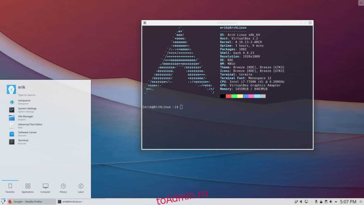 Он использует Plasma от KDE, который использует виджеты для создания настраиваемой и эффективной среды рабочего стола.