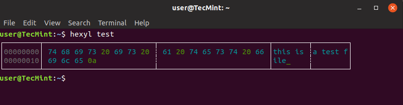 Другой полезный инструмент для проверки двоичного файла — это hexyl, простой просмотрщик шестнадцатеричных данных для терминала Linux, который использует цветной вывод для определения различных категорий байтов.
